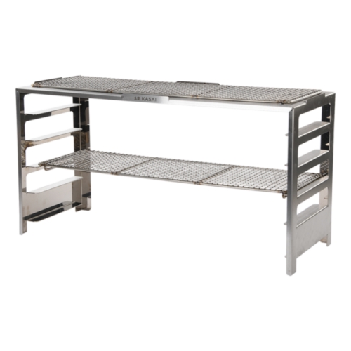 Zusammenbau? Das ist nicht nötig. Das Gestell ist so konzipiert, dass es direkt auf Ihren Kasai-Grill gestellt werden kann, unabhängig von der Größe, ohne zusätzliche Befestigungen. Die Einlegeböden lassen sich in der Höhe verstellen und können bei Bedarf ganz einfach abgenommen werden. Die Roste selbst sind das gleiche Modell wie die Standardroste von Kasai, so dass Sie bei Bedarf einfach zusätzliche Ebenen hinzufügen können (zwei sind hier enthalten). Und wenn Sie fertig sind? Werfen Sie alles in die Spülmaschine - Edelstahl hält das aus.