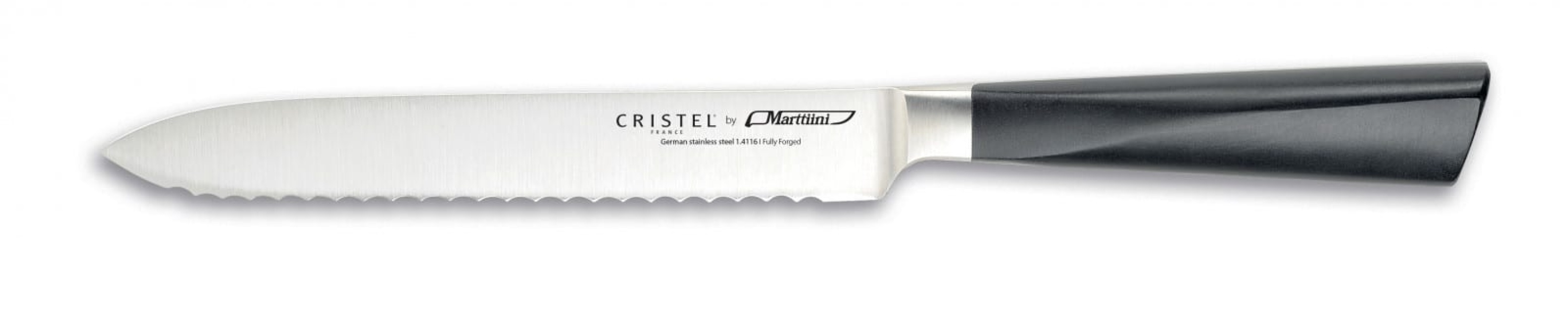 • Gezahntes Messer von French Cristel. Der Griff ist aus Polyoxymethylen gefertigt, das leicht zu pflegen ist und sich im Laufe der Zeit bewährt. Das Design ist modern und die Messer sind in Gewicht und Design gut ausgewogen. Cristel hat diese Messer zusammen mit dem finnischen Unternehmen Marttiini Marttiini entwickelt - einem renommierten Hersteller von Jagd- und Angelausrüstung.