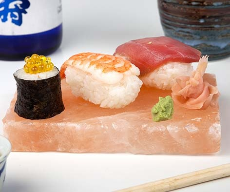 Ein beheizter Salzstein kann am Esstisch verwendet werden, um z.B. Fisch oder Fleischstücke zu garen.