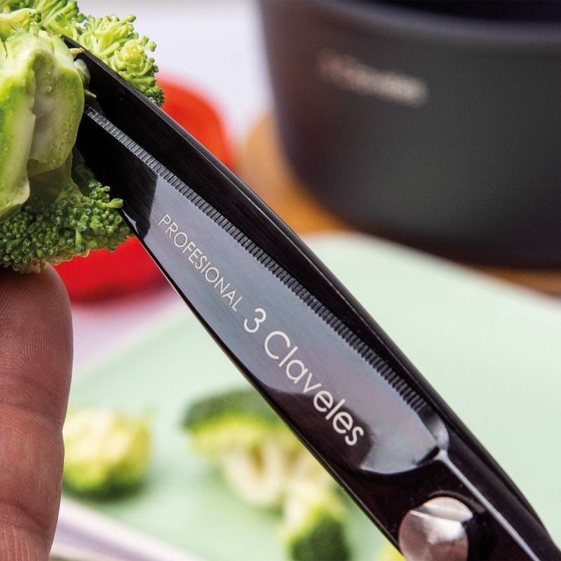 Diese Küchenschere von 3 Claveles ist nicht nur ein Werkzeug, sie ist eine Verlängerung Ihrer Hand, wenn es um präzise und wiederholte Arbeitsschritte in einer professionellen Küche geht. Sie ist aus Edelstahl gefertigt und verfügt über eine heißgeschmiedete Konstruktion, die für Stabilität und Torsionssteifigkeit sorgt und ihre Form sowie Schärfe auch unter hoher Belastung bewahrt. Jede Öffnung und Schließung fühlt sich direkt und kontrolliert an, sodass Sie mit dem Produkt arbeiten und nicht dagegen.