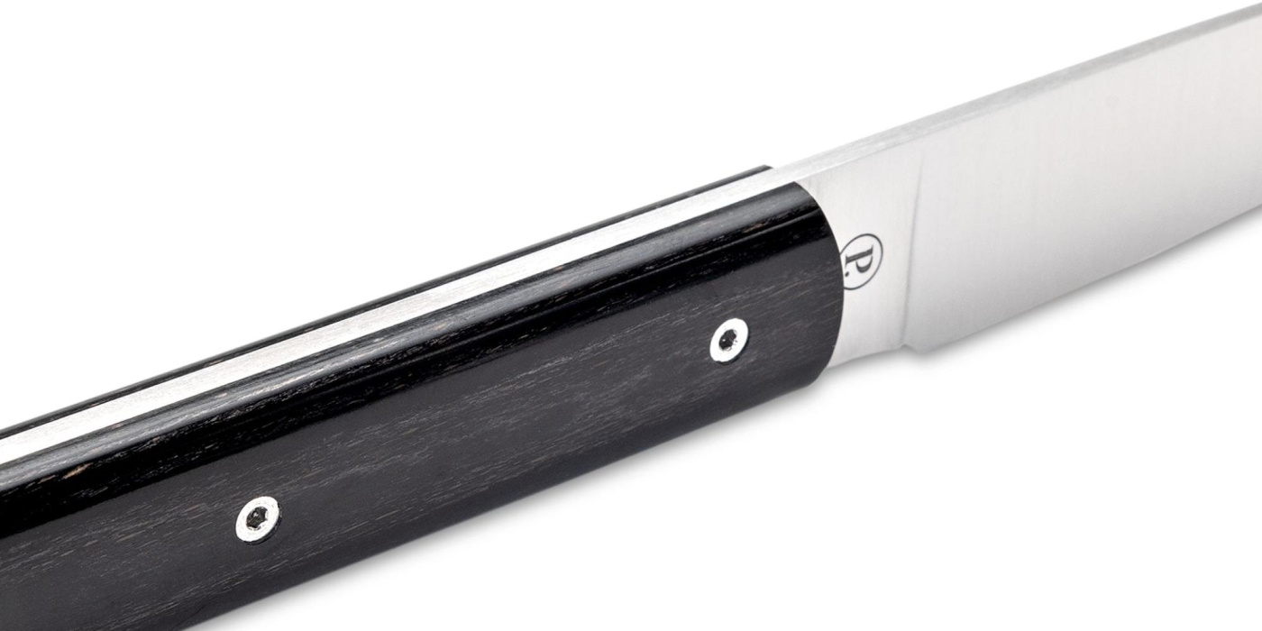 Die Klinge ist aus Sandvik 12C27M gefertigt, einem rostfreien Stahl mit 0,6 Prozent Kohlenstoff und 13,5 Prozent Chrom, der ursprünglich für Rasierklingen entwickelt wurde und seitdem zu einer gängigen Wahl in der Premiumklingenherstellung geworden ist. Der Stahl bietet gute Schneidenhaltigkeit, gute Korrosionsbeständigkeit und lässt sich im Vergleich zu härteren japanischen Stählen relativ leicht nachschärfen. Das Schleifen erfolgt langsam mit traditioneller Methode und die Politur erfolgt mit einer Büffellederscheibe, was der Klingenoberfläche eine charakteristische matte Oberfläche verleiht. Der Griff wird mit Innensechskantschrauben befestigt, die an den Seiten des Griffs sichtbar sind.