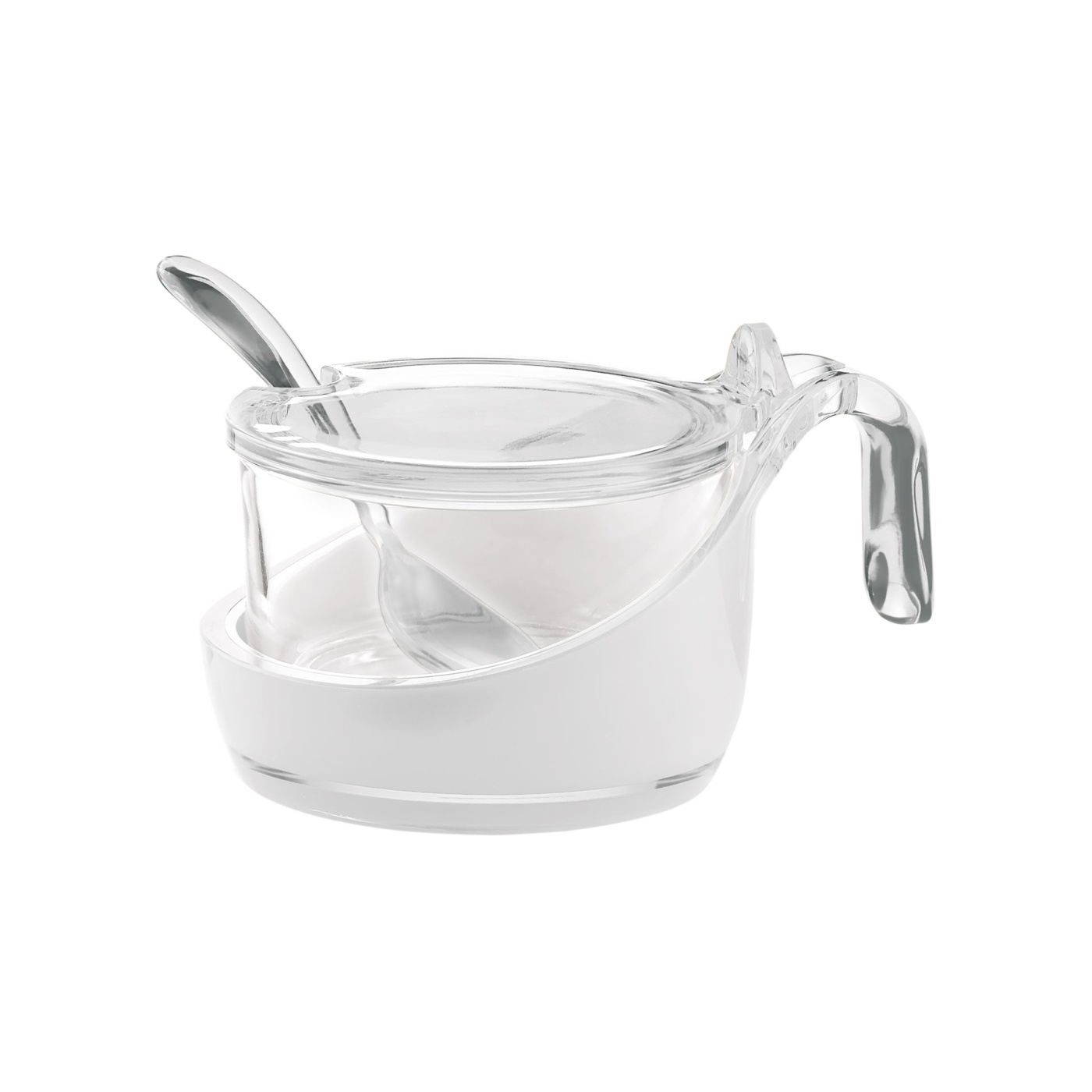 Die Schale besitzt einen Innenbehälter aus Glas und einen Deckel der sich mit einer Hand leicht öffnen lässt wenn Nachschlag gefragt ist. Der mitgelieferte Löffel liegt stets griffbereit im Deckel, was das Servieren sowohl am Esstisch als auch beim Frühstück oder Kaffee besonders bequem macht.