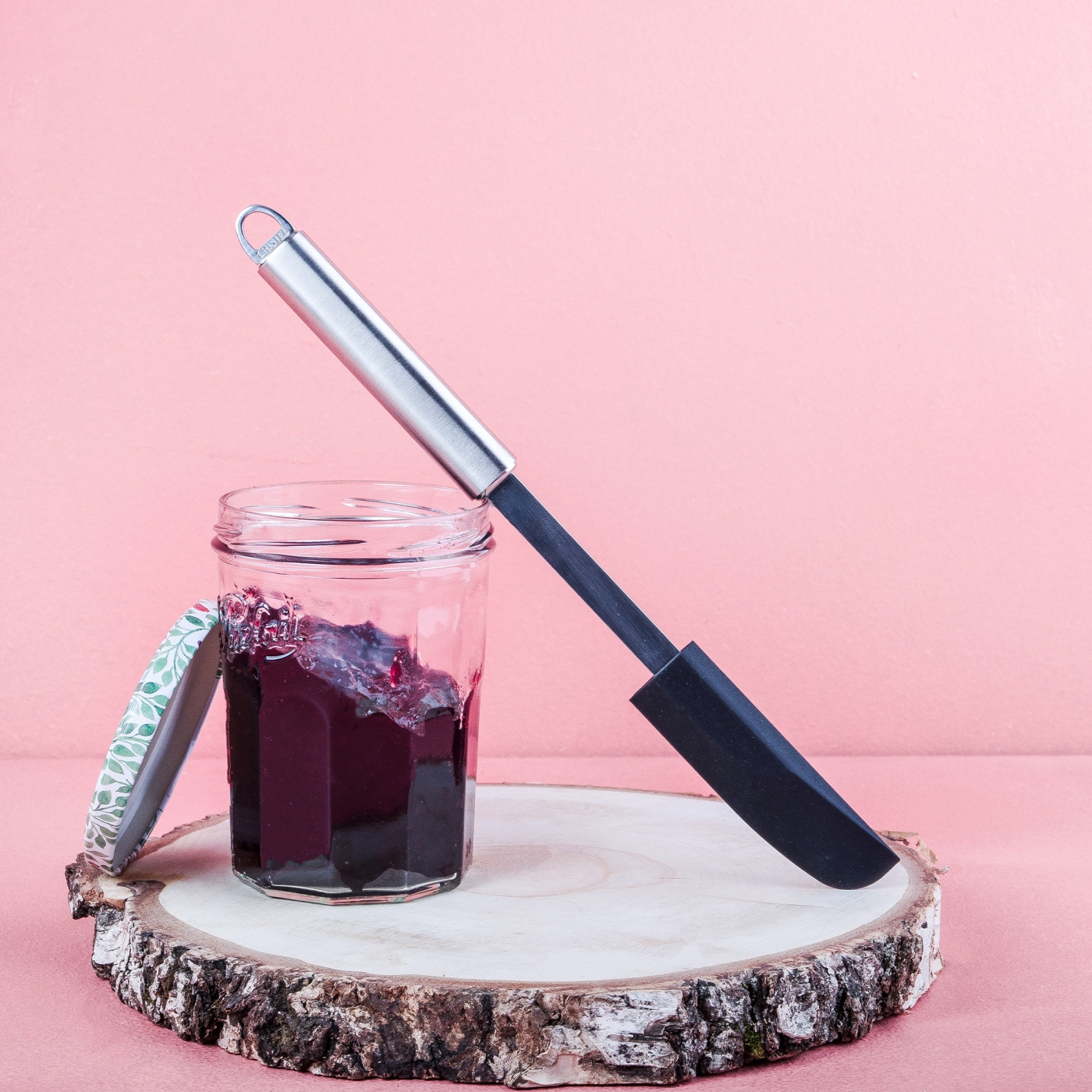 Lollipop aus rostfreiem Stahl und Silikon. Seine schlanke Form ermöglicht den Zugriff auf den Inhalt von Flaschen und kleinen Dosen und hilft, Lebensmittelabfälle zu reduzieren.