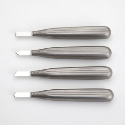 Set mit vier Werkzeugen für die Arbeit mit Schokolade. Sie wurden speziell von Enric Rovira entworfen, der ein Meister der Schokolade ist.
