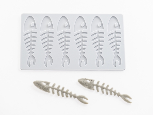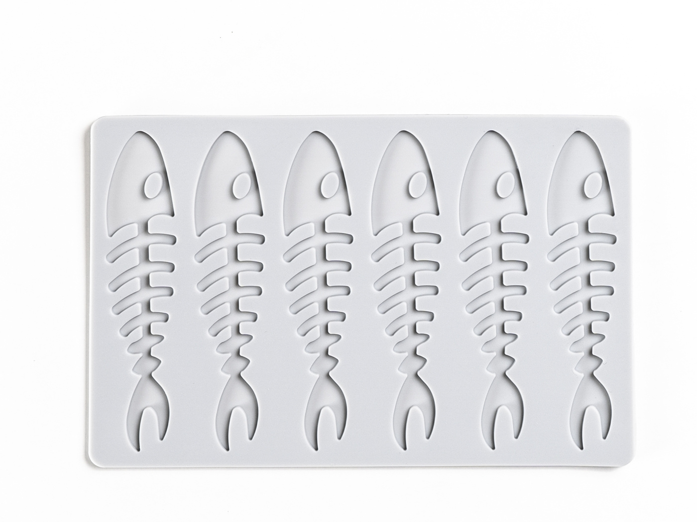 Die Form ergibt sechs Stück Sardinen und misst insgesamt 16 x 11 cm.