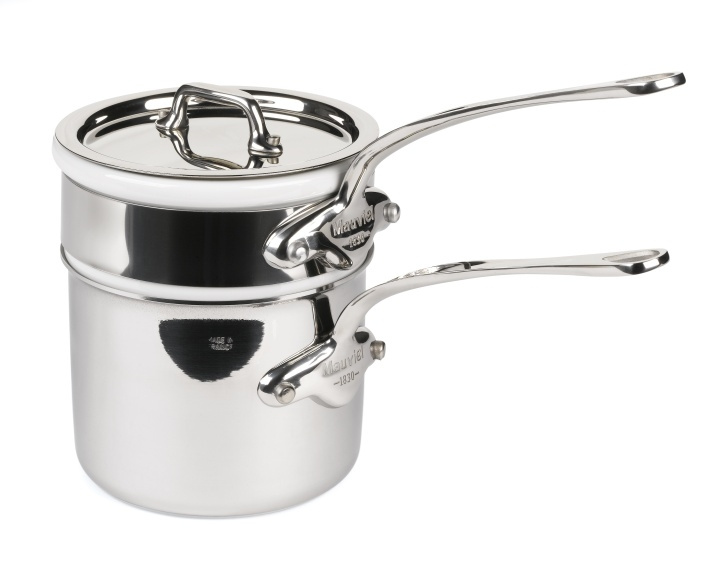 Bain-Marie pot with porcelain insert. Mauviel's "Cook Style" provides professional and amateur chefs with the best culinary techniques. Cook Style is made with 5 layers of stainless steel and aluminum for quick and efficient heat distribution. Cook Style is 50% more efficient than traditional sandwich-bottom pans, saving time and energy - Beautiful, polished design of the great quality from Mauviel. Layer 1 layer consists of 18/10 stainless steel for easy cooking and cleaning. Layers 2, 3 and 4 are made of aluminum, which distributes heat evenly and quickly. Layer 5 is made of magnetic 18/10 stainless steel for induction. Practical pouring spout that prevents dripping. Large, professional, riveted handle. For all heat sources.
