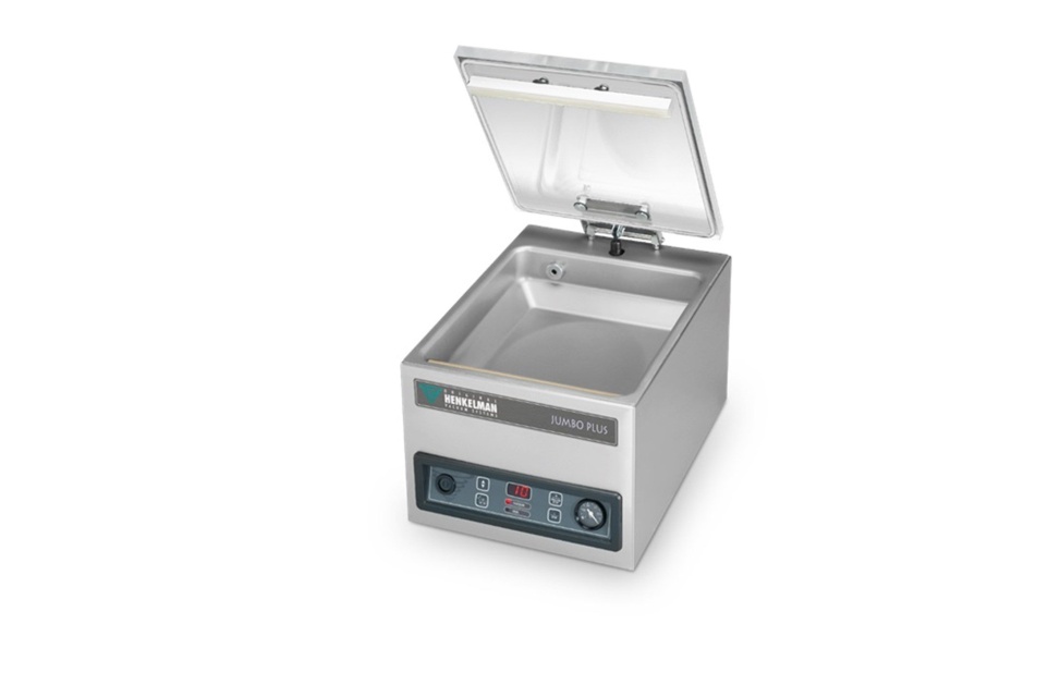 The Jumbo Plus is basically the same machine as the Jumbo Mini, but with a more powerful pump and thus a faster process. Jumbo Plus (together with Jumbo Mini) is the smallest of Henkelman's models and has a sealing width of 28cm. In addition, it is double sealed. You can also remove the sealing strips for cleaning if you're a bit of a prude. The pump in the machine is made by Busch and has a capacity of 8 m3/h. The cycle of the machine is 15-35 seconds and has the capacity to save a program in memory. The chamber is deep (85mm) and made of stainless steel, but can also be made shallower using a removable bottom plate that makes the chamber smaller. The lid is also high (130mm) to accommodate more food. The dimensions of the chamber are 31cm x 28cm. The overall dimensions of the machine are 45cm x 33.4cm x 30.5cm but the height is 63cm when the door is in its slightly angled maximum position. Weight 32kg. Please note that this machine is not a stock item but is ordered on demand.