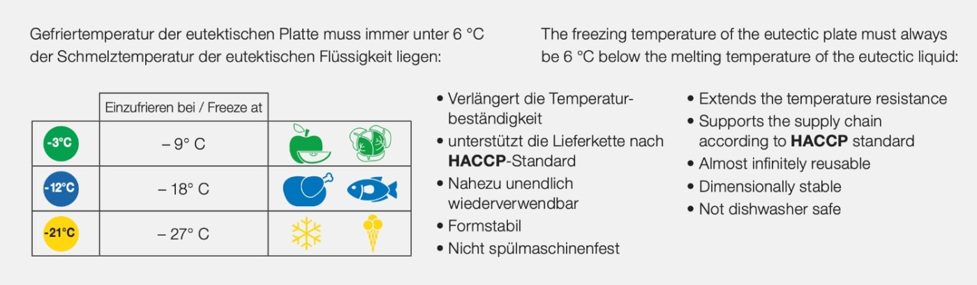 Cooling blocks in polyethylene moulded to GN dimensions for direct use in Schneider's transport boxes. The filling is formulated to hold the temperature at -12°C, suited for transporting deeply chilled cooked food, fish and shellfish as well as products requiring refrigeration below freezing point without being deep frozen. For transport of fresh produce and dairy, the -3°C version is sufficient, while deep-frozen products such as ice cream and frozen meat require -21°C.