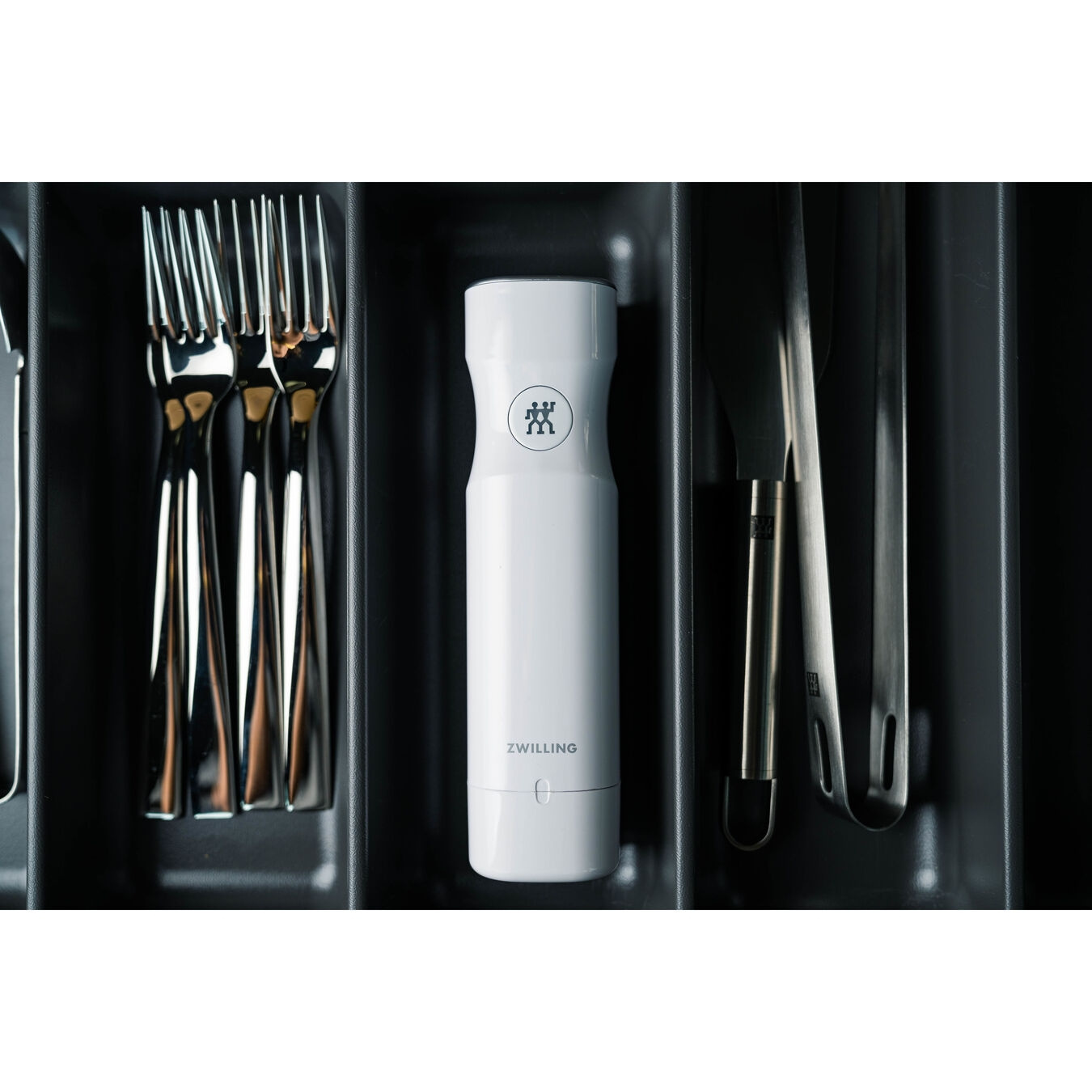 Zwilling's Fresh & Save is a revolutionary way to keep your food fresh up to five times longer. Like the wine bottle vacuum pump you are probably familiar with, air is pumped out of the container using a handheld pump. In this case, an electric one, which makes it very easy and convenient. The pump is used for glass boxes, zip bags, wine corks or blender jug lids in the same Zwilling range, all of which have a valve where you suck the air out of the container after filling. Not only do you reduce your waste by keeping your food fresh for much longer, you also reduce your consumption of plastic bags, vacuum bags and plastic film. Compatible containers and other accessories are purchased separately.