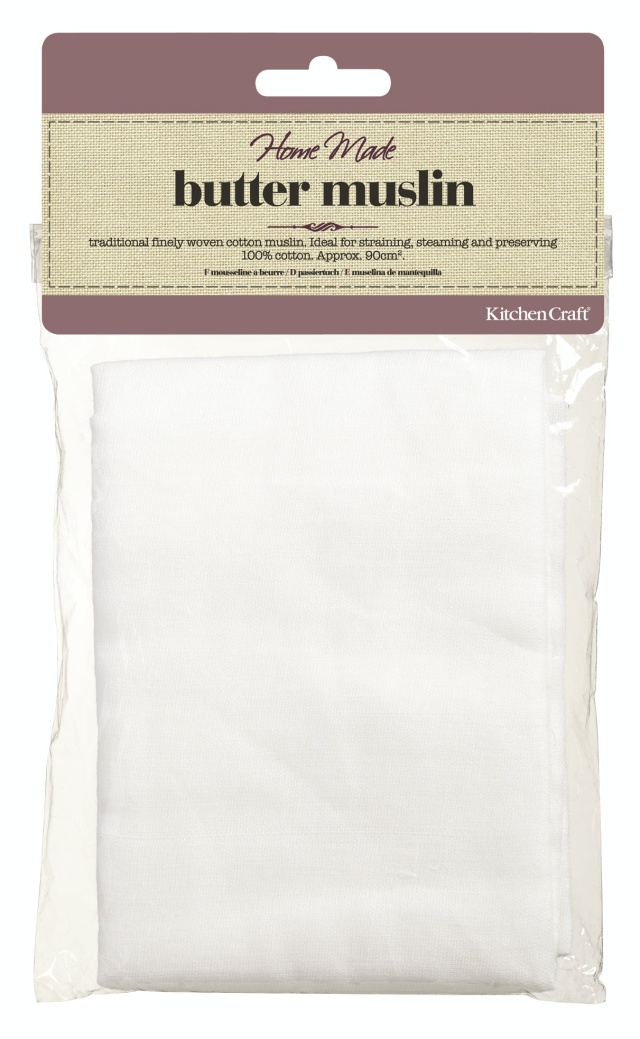 Finely woven cotton strainer from Kitchen Craft for draining, cheese and butter making, steaming and much more. 90 x 90 cm. Can be cut to the size you want. Can be washed and reused.