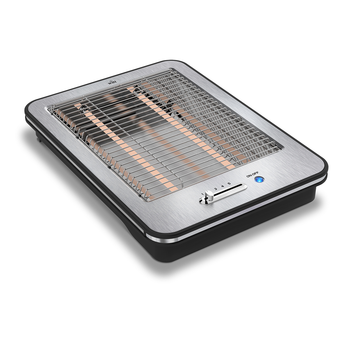 Toaster of unconventional model that has a heating element as a horizontal plate on which you put bread, croissants or other pastries. The toasting surface is 20 x 25 cm and has five settings. Pull-out crumb tray for easy cleaning. Stainless steel chassis.