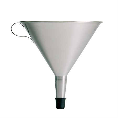 Funnel with built-in strainer made of stainless steel.