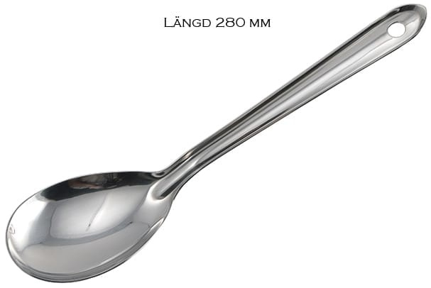 Serving spoon with hole for suspension, stainless steel. Suitable as utensils for cooking as well as serving at the table. Industrial design at its best (robust quality of the steel, folded upwards to fit perfectly in the hand)! A seemingly simple item but which when used radiates complete perfection. This spoon has its own internal fan club among the KitchenLab staff - it's at the top of the list of most useful (and sold) items for many of us. Length 28cm.