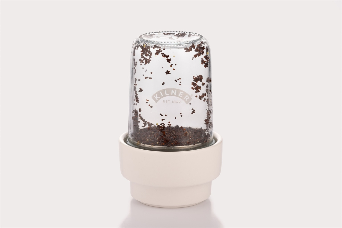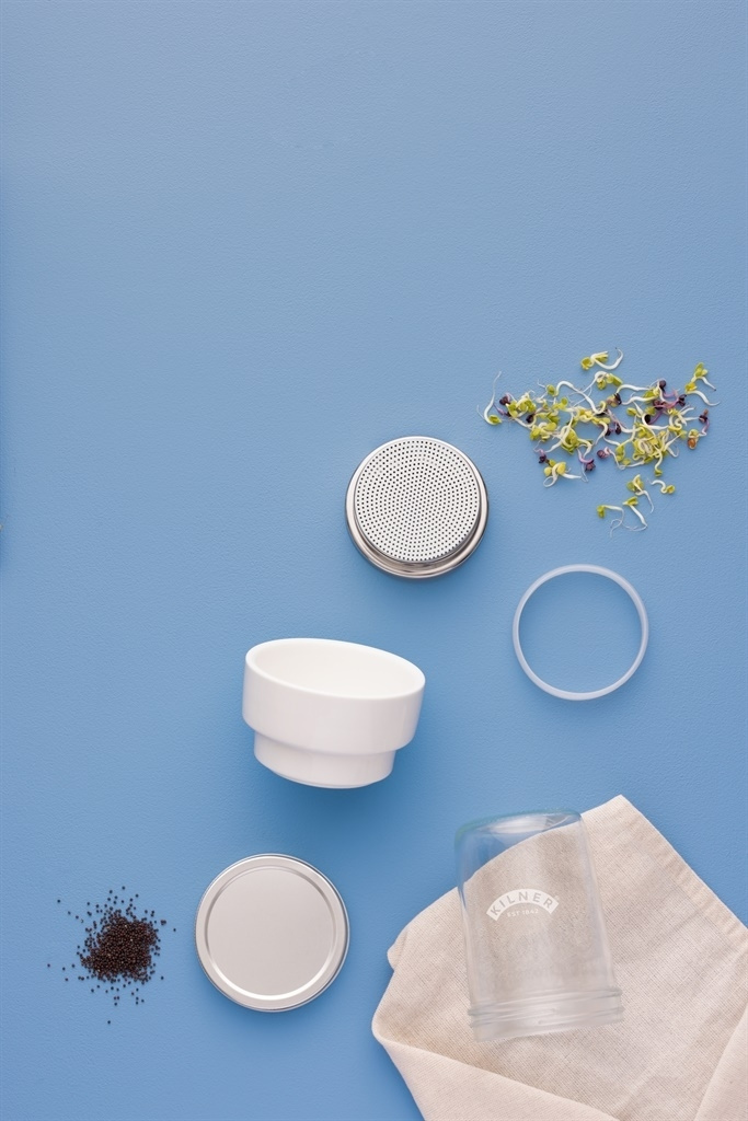 A dome that helps you grow your own sprouts and microgreens for fancy plates. Consists of a ceramic base, silicone and metal mesh insert and the glass jar itself. A simple but attractive design for display in the kitchen. Ø 11.5 cm, height 21 cm. Volume 500 ml.