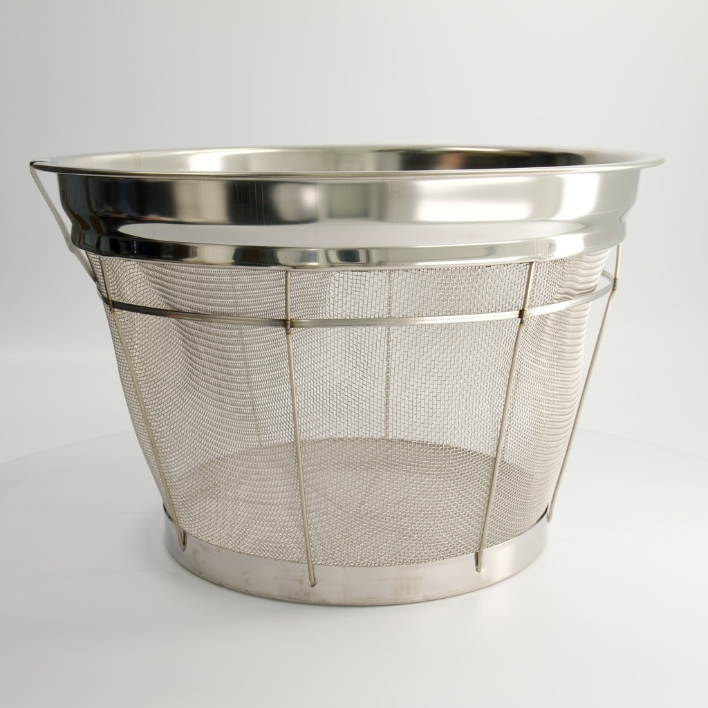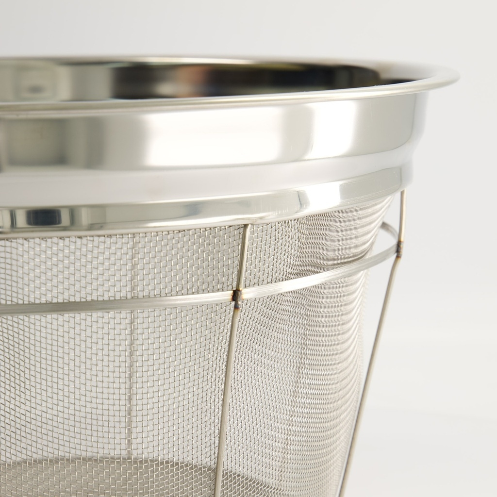 A professional Japanese zaru stainless steel colander with a deep, conical shape that makes it perfect for rinsing, straining and quickly cooling noodles, rice or vegetables. The sturdy construction with tightly welded mesh provides fast draining and high durability even under intensive use.