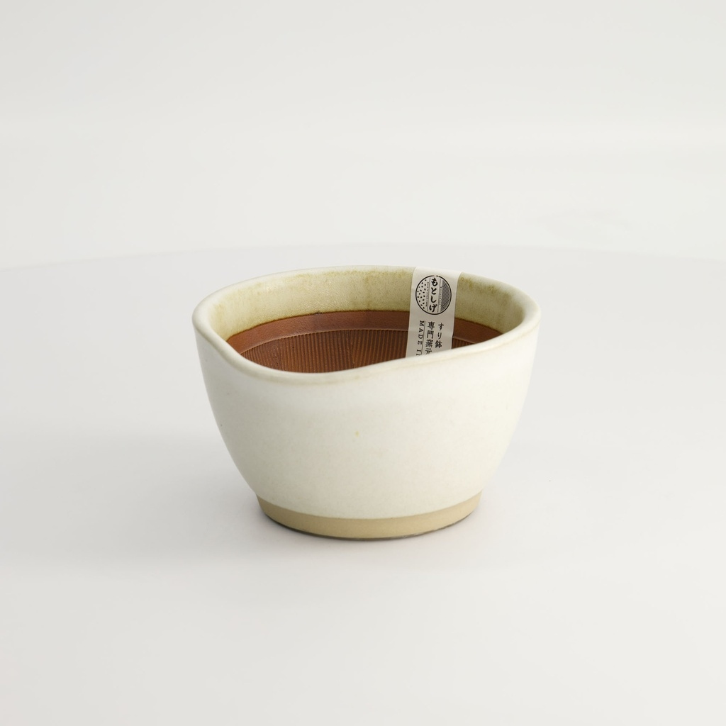 This Japanese mortar, called suribachi, is made of glazed ceramic with an internally grooved surface that makes it easy to grind sesame seeds, spices or nuts to perfection. The white glaze gives it a timeless look that makes it equally at home in modern and traditional Japanese kitchens.