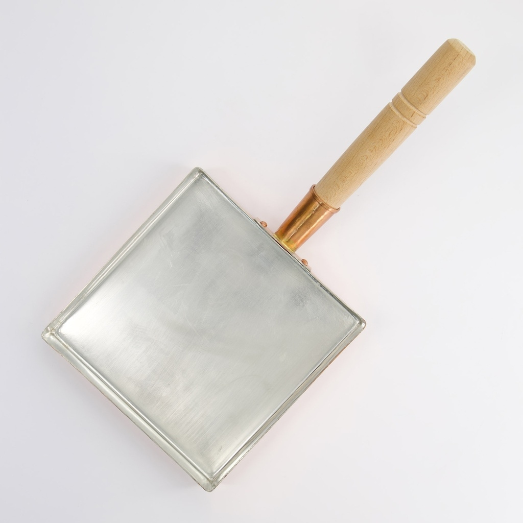 The shape is square to give straight edges and an even result, but the real quality of the pan is in the material. Copper conducts heat better than any other metallic material and provides an even, controlled temperature over the entire surface, allowing the egg batter to coagulate slowly without burning or drying.