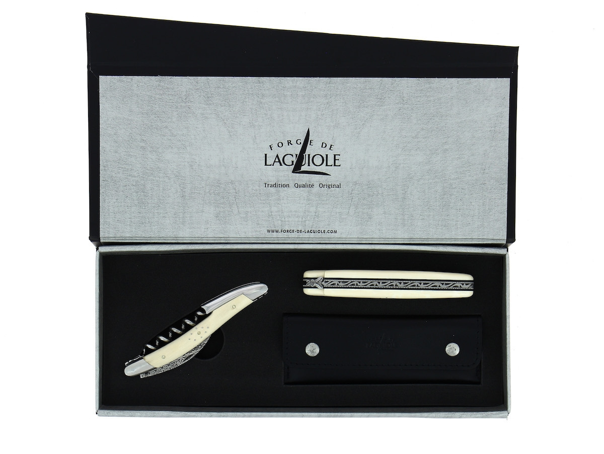 Mammoth horn folding knife and sommelier knife, damascened - Forge de Laguiole