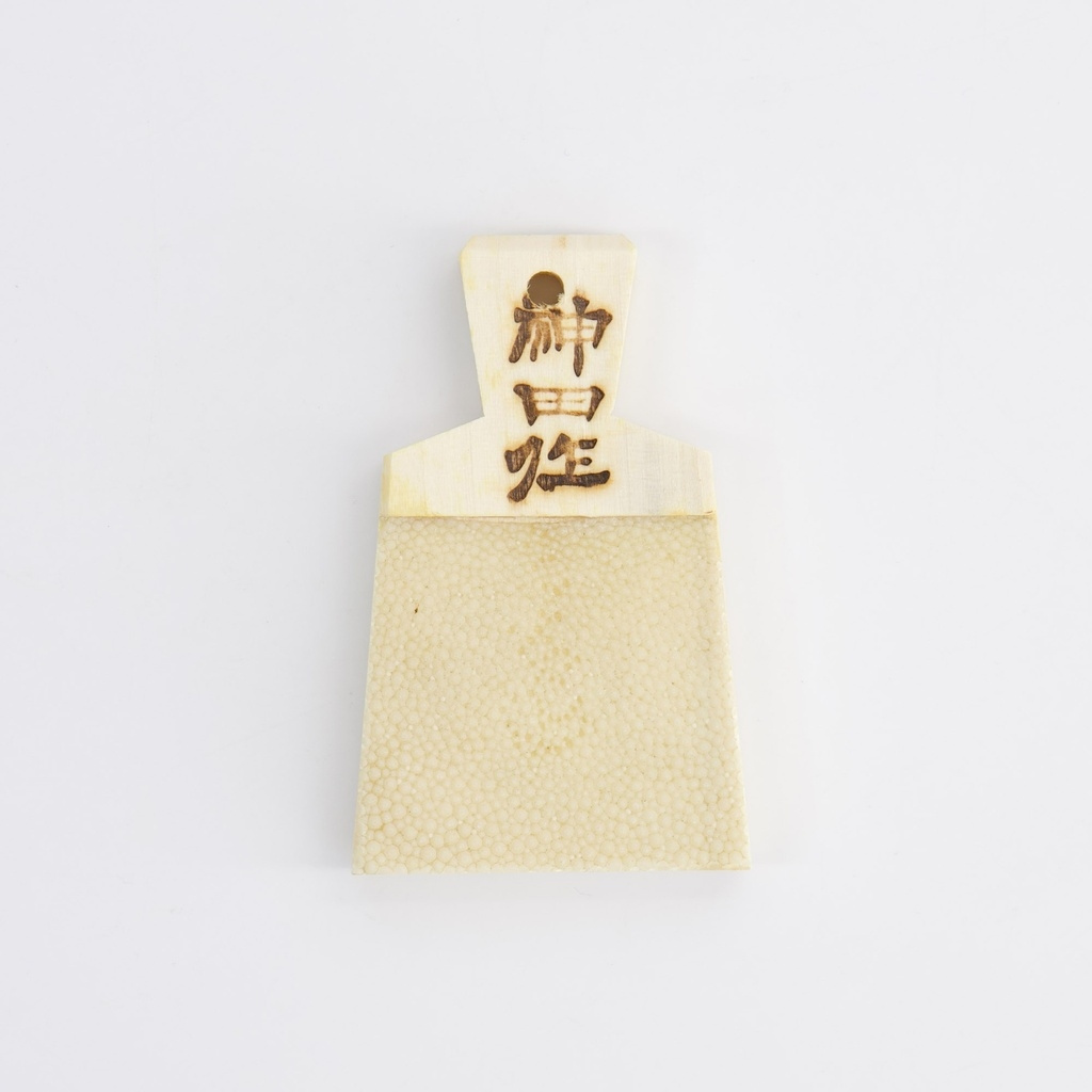 The surface is made of dried sharkskin glued to a wooden board. It may sound strange, but the microscopic tooth structure of the sharkskin is perfect for atomizing wasabi without crushing the cells. The result is a creamy, almost whipped texture that releases the flavors gradually, rather than hitting the taste buds like a vicious mustard bomb.