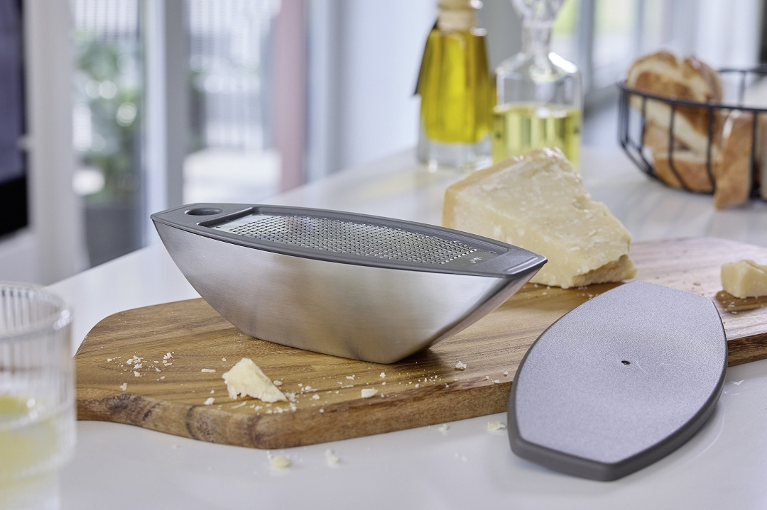 A cheese grater that you can use to grate, serve and store cheese. This exclusive cheese grater from Zack is made of high quality satin finished 18/10 stainless steel with a removable grating insert. The cutting surface is precisely etched from the material rather than stamped, which means the blades are extremely sharp. Thanks to the removable grating attachment it can also be used as an elegant serving bowl on the table, or for storage once closed with the matching grey plastic lid. Perfect for creating a lovely Italian atmosphere at home and a very stylish Parmesan grater to keep on the table.