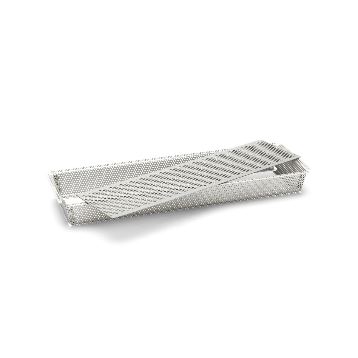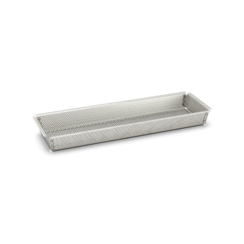 Mold for an oblong cake or pie. The perforated surface allows more air to flow through, giving a crispier surface to your baking. For really crispy crunchy things, you should choose a perforated mold. The mold has a removable bottom so you can easily get your product out and for easy cleaning. The mold comes with pre-cut nonstick baking papers that are reusable up to 200 times, but you can also bake in it without paper. Withstands temperatures between -170°C and +260°C. Also dishwasher safe. The cookies will be 35 x 10.5 x 3.5 cm, while the mold is thus slightly larger. Made of stainless steel.