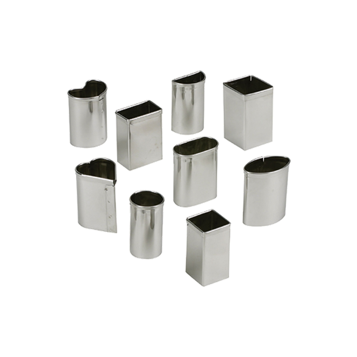 The set contains nine stainless steel cutters in nine classic petit four shapes: arch, curve, diamond, heart, oval, round oval, round, rectangle and square. The variety of shapes covers the traditional petit four range and enables consistent shaping without changing tool sets.