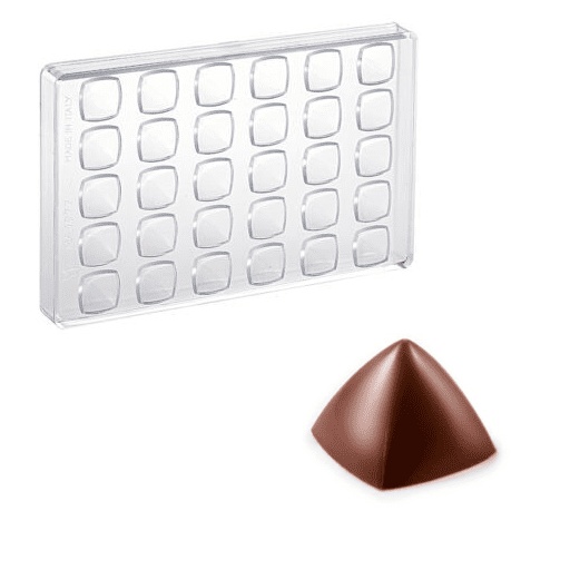 Hard plastic praline mold that makes small pyramids. Each mold has room to cast 30 chocolates of 7g. The mold is 275 x 175mm.