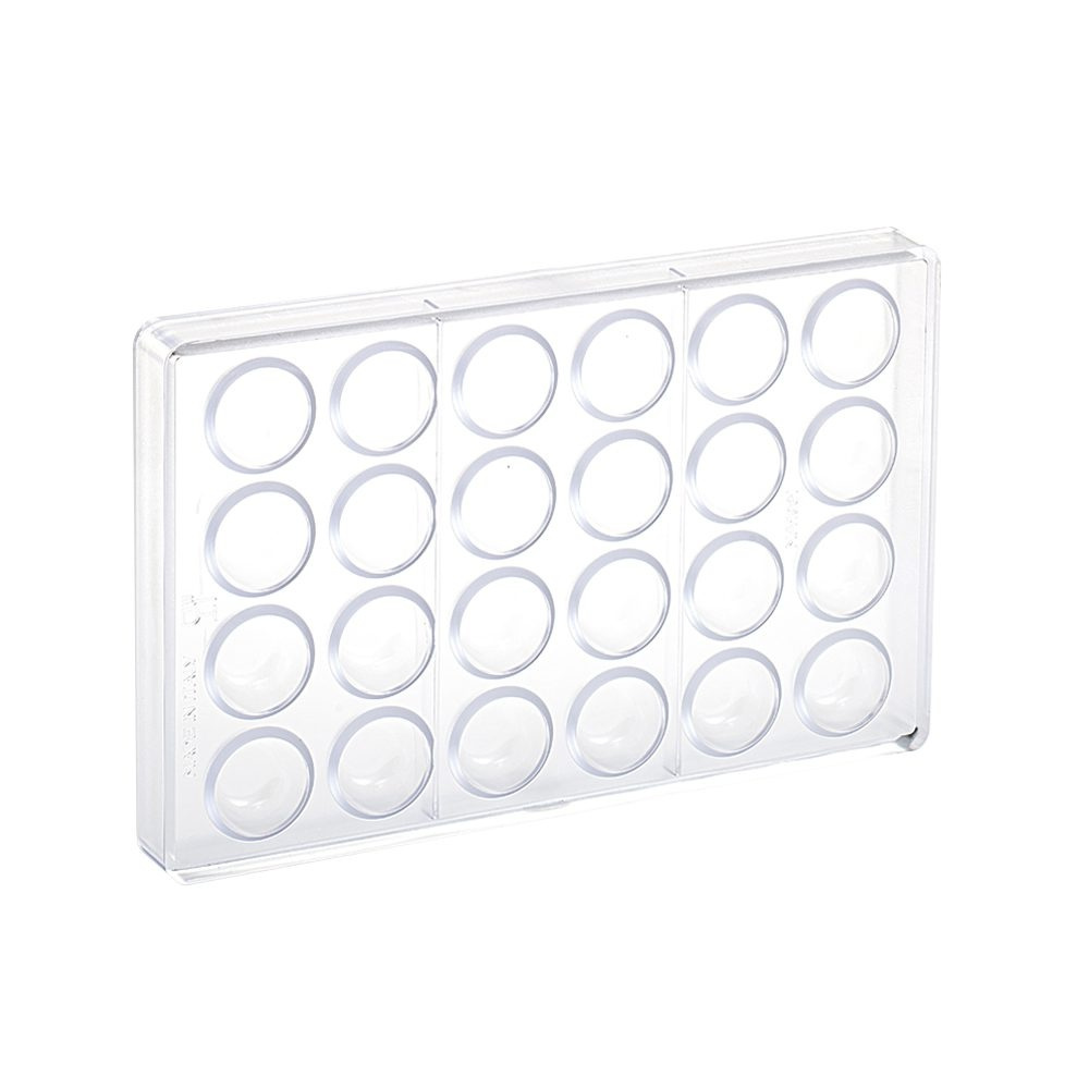 Hard plastic praline mold that makes small domes with a flat top. Each mold has room to cast 24 chocolates of 10g each. The mold is 275 x 175mm.