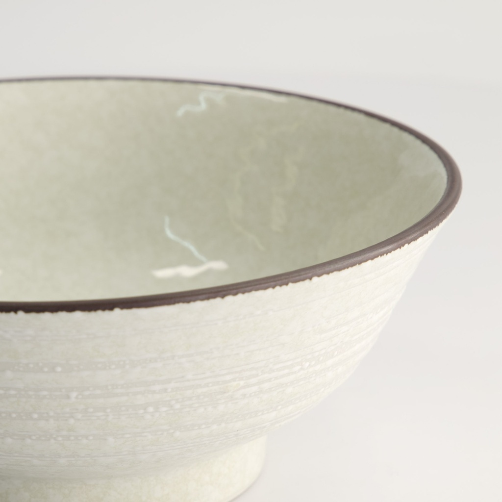 Made from Japanese stoneware, the Hime Kobiki ramen bowl combines elegance with function. The light, almost pearlescent glaze and thin dark rim give the bowl a timeless aesthetic that highlights the colors of the ramen, soba or udon.
