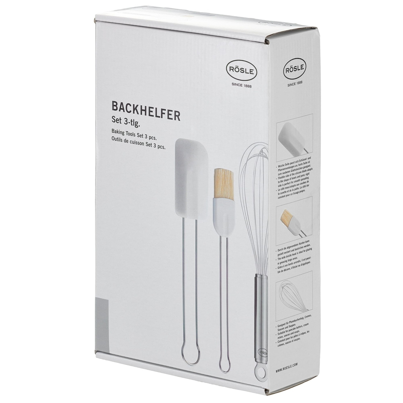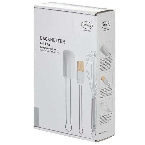 Three-piece baking set from quality manufacturer Rösle with a spatula, brush and balloon whisk. The design is sleek and the quality is high.