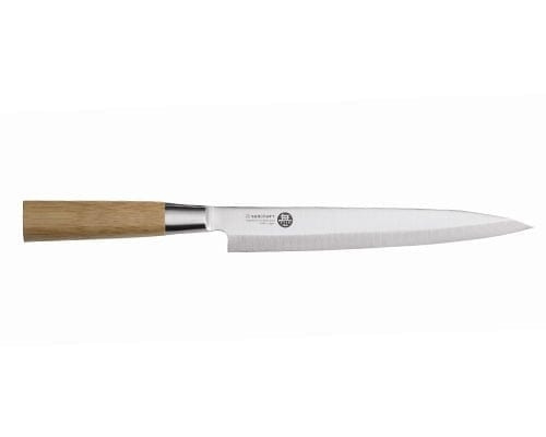 Suncraft Bamboo 25 cm sashimi, is an ideal knife for cutting raw fish. The long, narrow, single-edged blade helps to cut and hold the slices of the often delicate fish.