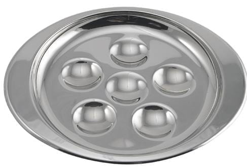 Stainless steel snail dish with six holes.