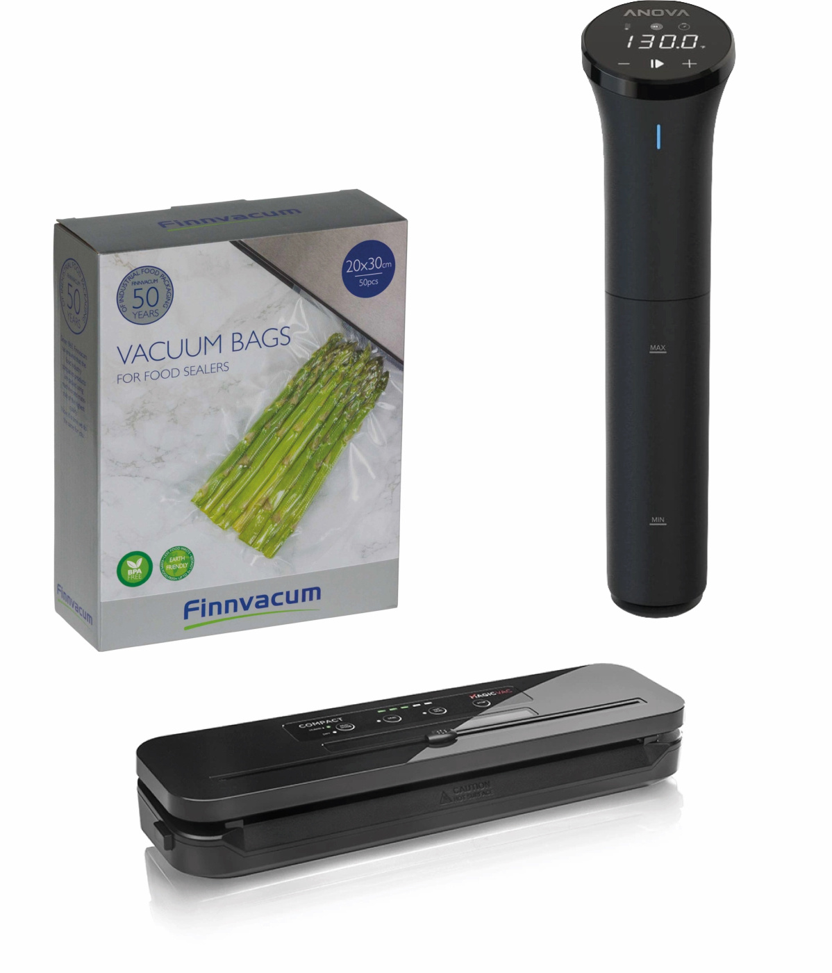 A complete package for those who want to start with sous vide. It contains Anova's most compact sous vide circulator, Anova Nano with bluetooth, a vacuum machine from Magic Vac and a 50-pack of bags from Finnvacum.