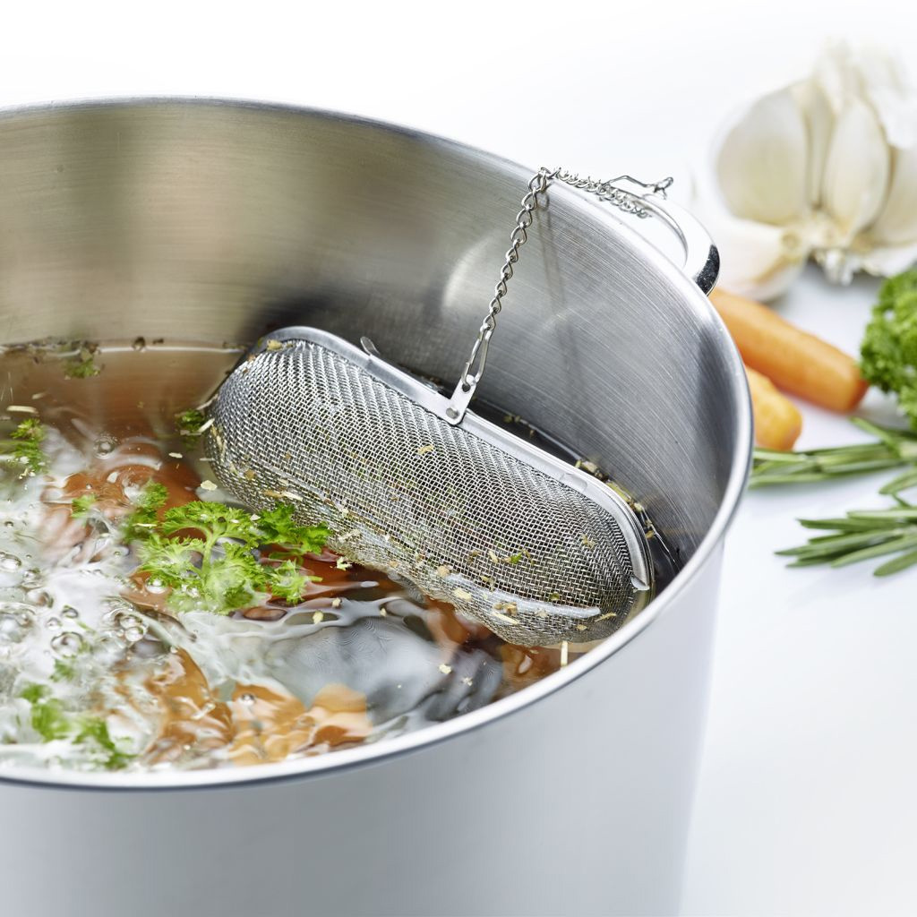 At approx. 11 cm long and more than 4 cm in diameter, the oval spice strainer is the ideal size for holding spices and herbs during cooking and is also suitable for making tea in an appropriately sized pot. It can be filled easily by simply opening tthe lid and closed tightly again thanks to the side closure mechanism. The long chain with integrated hook ensures that the strainer does not fall into the pot during cooking. The practical stainless steel sieve is ideal for both home and restaurantuse. It is taste-free and can be easily cleaned in the dishwasher after use.