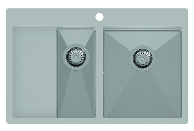 Double stainless steel sink 780 x 500 mm with storage area on the left for recessed installation in the worktop.