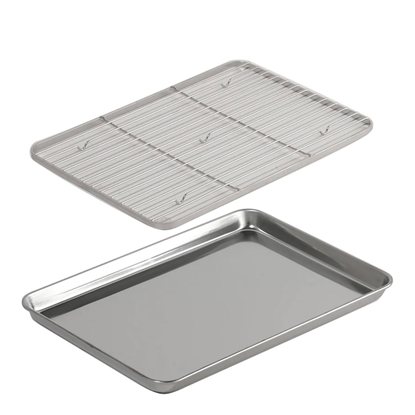 Both tray and griddle are of course oven safe and stainless steel is a material that is very suitable for cooking. In addition, it is durable and can withstand the pressure even in a hot restaurant environment. Everything is oven and dishwasher safe, but not microwave safe. The mesh on the grid is 17 mm.