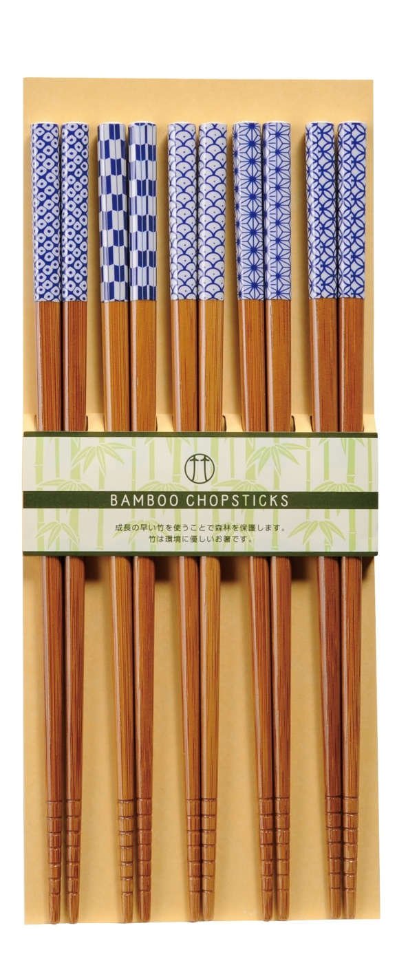 Set of five pairs of chopsticks with a graphic pattern in blue and white. Made in Japan from bamboo with a polyester cover. The chopsticks are machine washable.