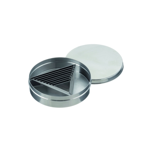 The set contains nine triangle-shaped cutters with plain edges, made from 0.4 mm stainless steel, with side lengths from 42 to 124 mm in nine steps. The height of 30 mm gives the shapes stability under the pressure of cutting. Storage box included.