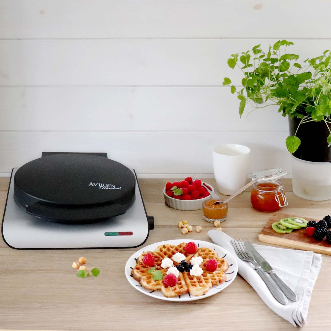 An elegant and powerful waffle iron for those who want to bake larger heart shaped waffles with an even and crisp result. With solid power the iron heats up quickly and distributes heat evenly across the plates, giving the waffles a golden surface and a soft interior without burning.