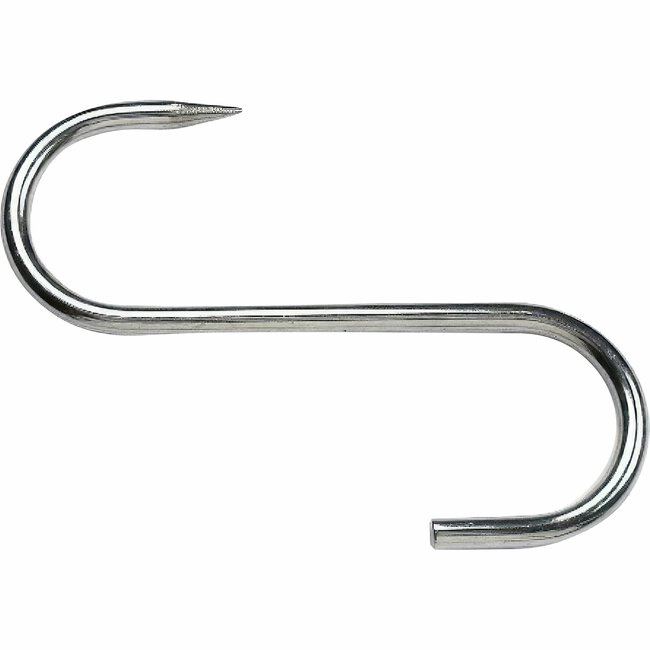 Crochet à viande en forme de S avec une extrémité pointue pour suspendre et attendrir ou sécher les morceaux de viande, les saucisses et la charcuterie. Fabriqué en acier inoxydable.