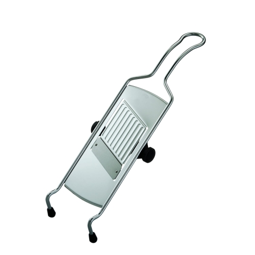 Mandoline en acier inoxydable de Rösle avec lame réglable. De petits pieds en silicone assurent sa stabilité sur l'établi.