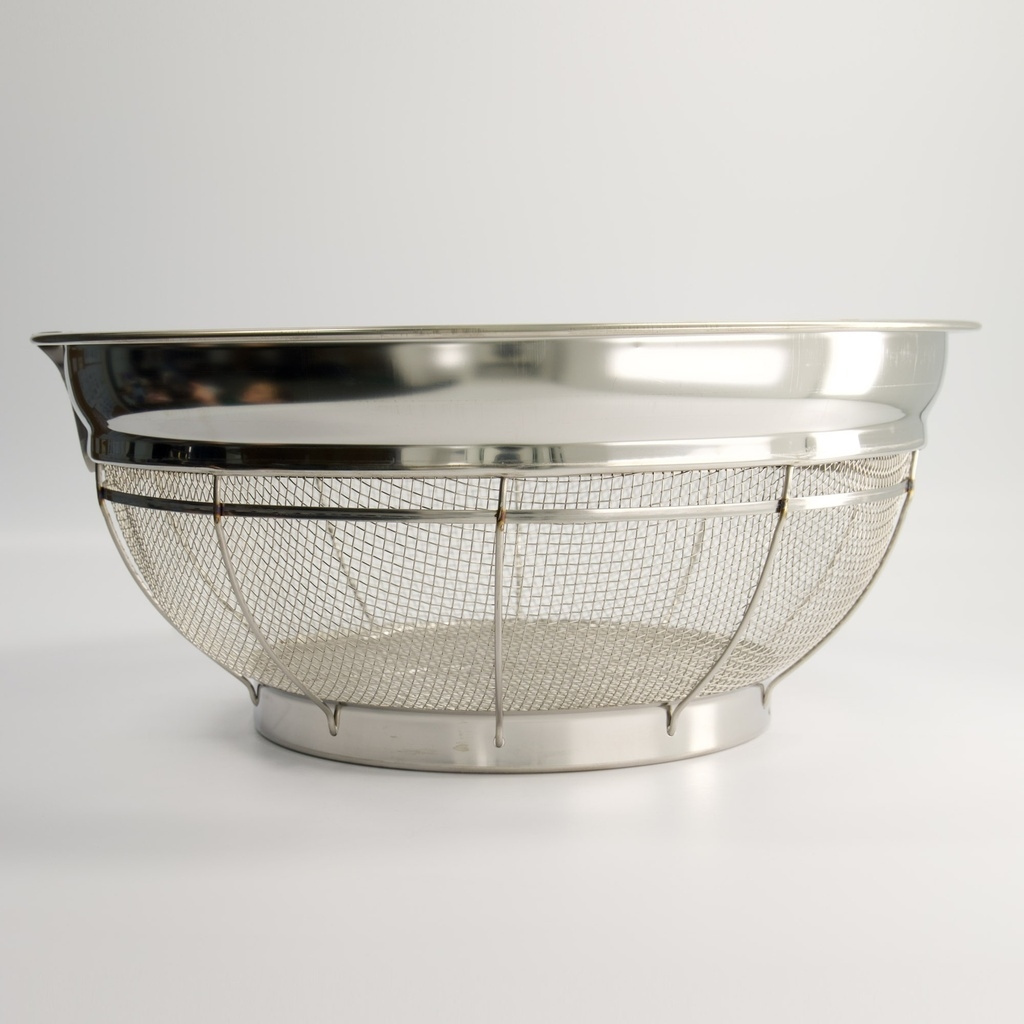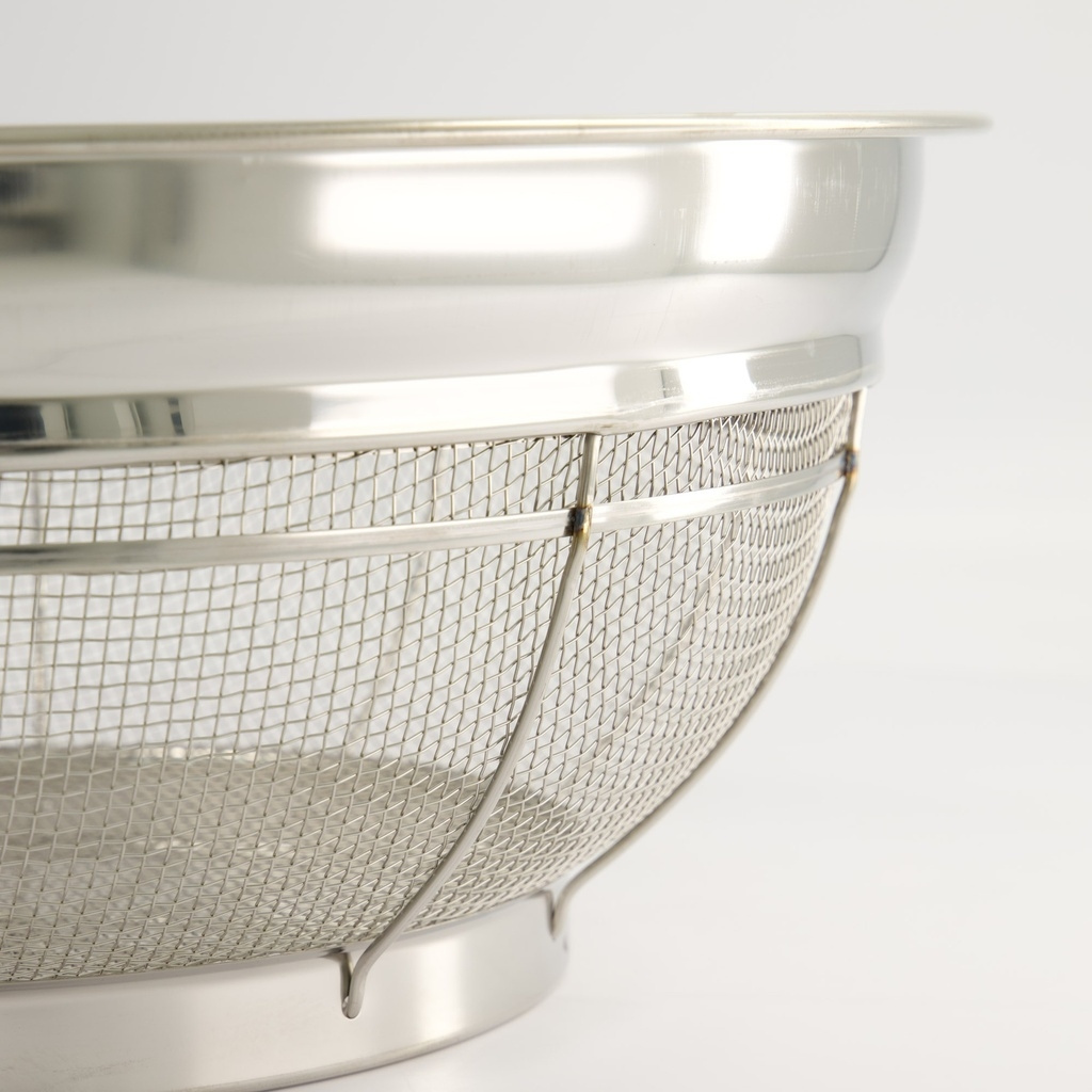 Une passoire japonaise professionnelle en acier inoxydable (zaru), conçue pour la précision dans la cuisine. La forme peu profonde et la structure dense du treillis métallique permettent à l'eau de s'écouler rapidement sans coller aux ingrédients, ce qui la rend idéale pour les nouilles, les légumes, le tofu et le riz.