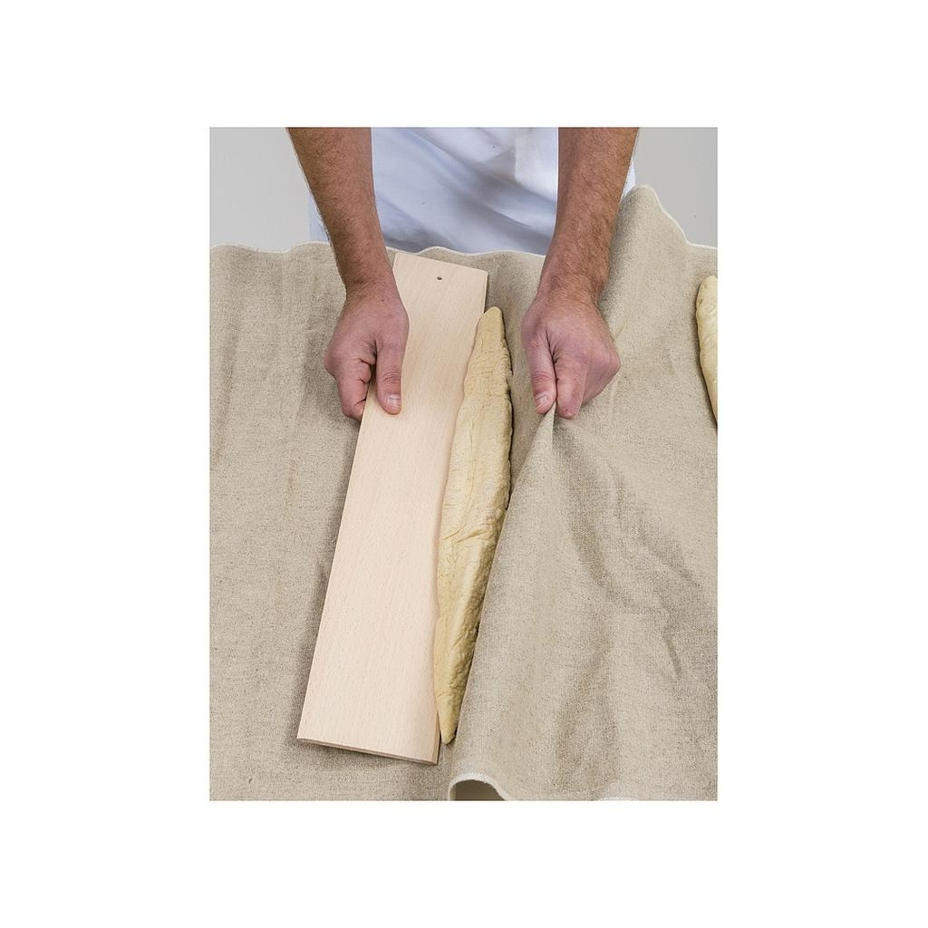 Flipping board for easier handling of baguettes fermenting in linen cloth. Simply use it to move the dough and loaves instead of having to lift them around. Just like a big wooden scratch board. 60x10cm.